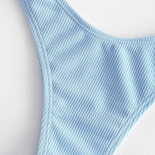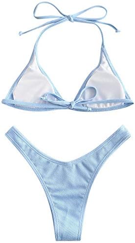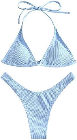 【Style】Ribbed two-piece bikini set comprises a pair of high-leg briefs and a coordinating halter bikini top.