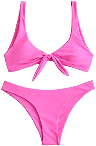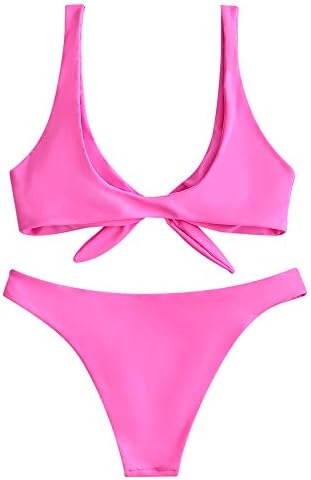 ZAFUL Women's Tie Knot Front Plunge Scoop Neck Bikini Set Two Piece Swimsuit
