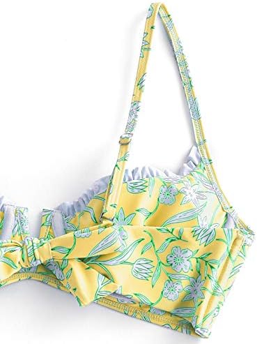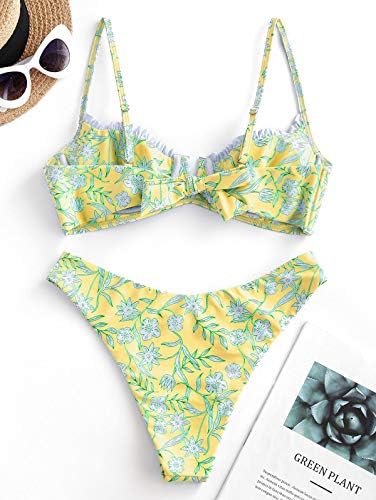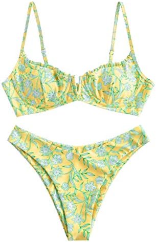 ZAFUL Women’s Floral Print Push-up V-Wire Lettuce Bikini Set High Cut Spaghetti Straps Underwire Padded Swimsuit