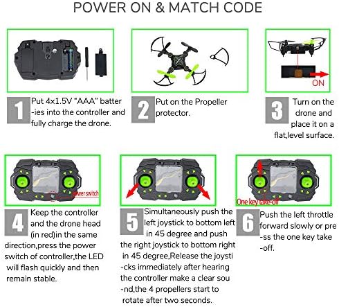 5. Take off:Simultaneously push the left joystick to bottom left in 45 degree and push the right joystick to bottom right in 45 degree,Release the joysticks immediately after hearing the controller make a clear sound,the 4 propellers start to rotate after two seconds,push the left throttle forward slowly or press the one key take-off.